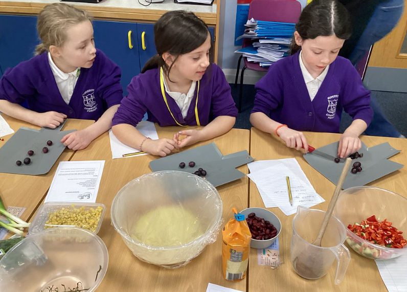 In preparation for our THRIVE Outside day at Mount Edgecombe next week, all year groups have taken part in a Food is Fun workshop, where Tami and her team have taught us how to prepare a variety of healthy 'snacks' or lunchtime treats. We go to apply our Y4 'spreading' skills when buttering bread and our Y3 'chopping' skills to dice and slice many different vegetables. 4 meal options were created: egg sandwiches, cheese sandwiches (with whatever 'extras' we wanted), rainbow couscous and a pasta salad. To top off a very interesting day, we invited in our parents to share the munching! You can see from their faces, how much they enjoyed benefitting from our culinary skills!