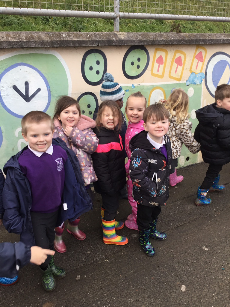 The foundation children enjoyed their first welly walk. We lit the fire and enjoyed hot chocolate and a biscuit. We used natural materials that we found in our environmental area to make faces. We also had a fun game of hide and seek.