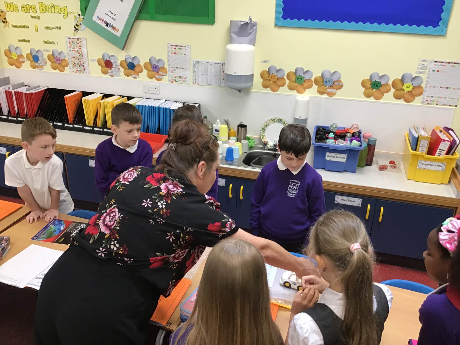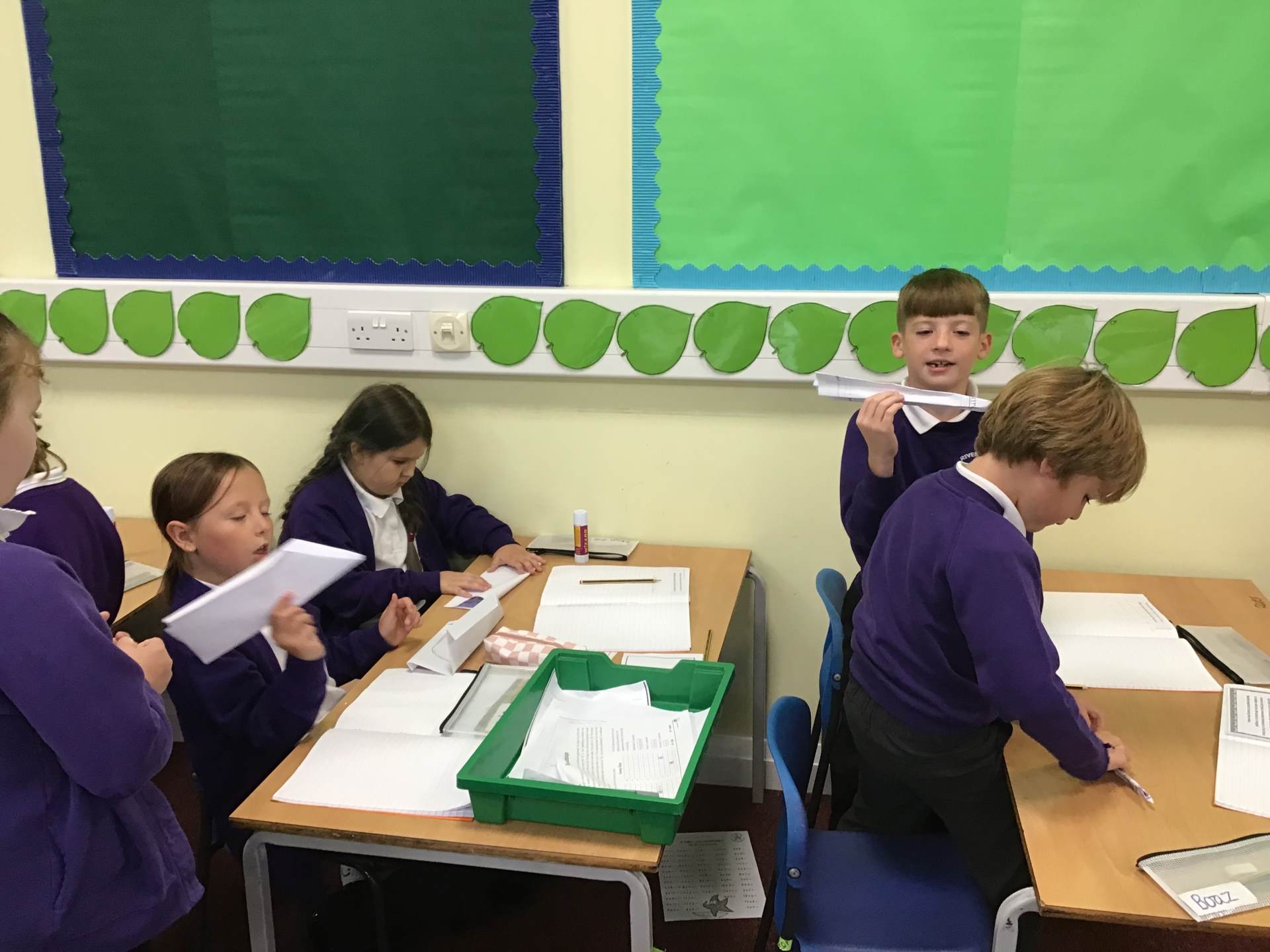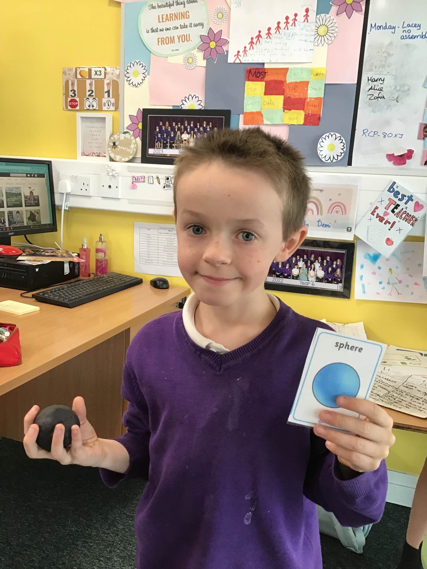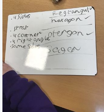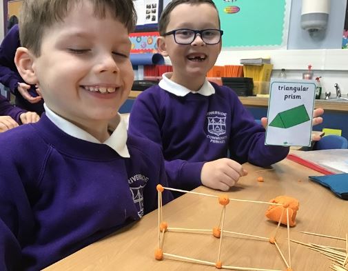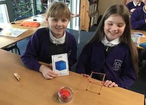 In maths, we have been investigating2D and 3D shapes. We have discovered that angles are related to turns. Whilst learning about 3D shapes, we used different modelling materials to make our own cubes, cuboids, cones, triangular prisms, squared based pyramids. We looked carefully at the shapes of the faces and counted how many there were as well as counting the number of edges and vertices.