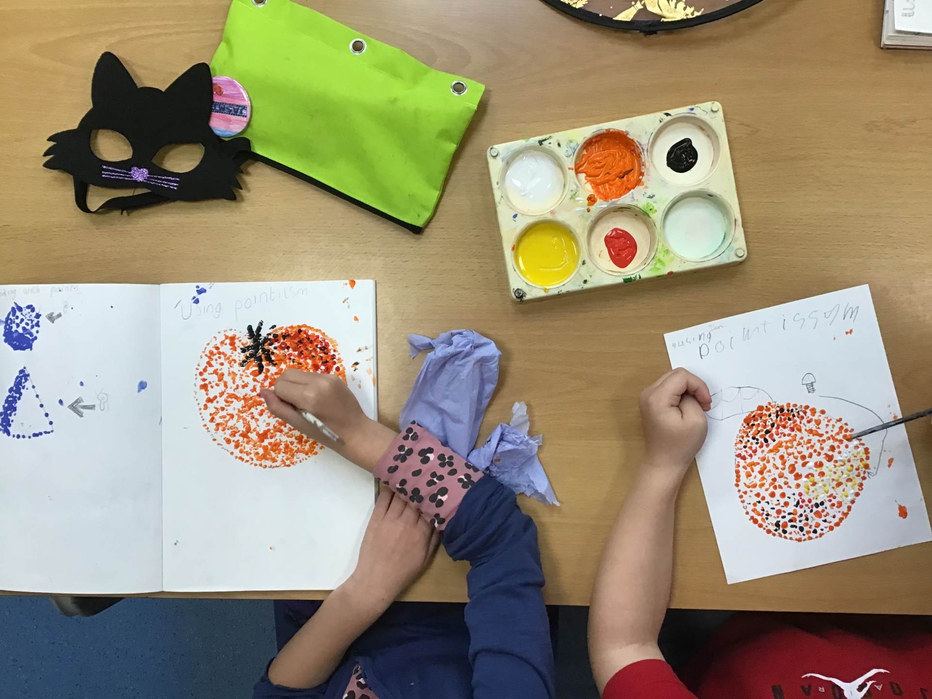 Year 3's art project for the autumn term has been all about 'Pointillism', a technique of painting that only uses dots to create masterpieces! Famous artists who used this style of painting included Georges Seurat and Paul Signac who we learned about before trying it ourselves. As you can see it might seem like an 'easy' technique to use but it's not: it required us to be very patient and resilient if we wanted to create images which looked like the objects we chose. We did lots of practice to start with - colour mixing (without actually mixing paint) by using overlapping dots (points), creating tone by spacing out points to create lighter shades and making dots come closer for darker shades as well as using white and black to our primary colours. We also experimented with different utensils to see which gave us more control over the 'points' we made: we preferred the end of the paintbrush - not the bristle end! You can see from our faces how proud we are of our efforts - why don't you give it a try!